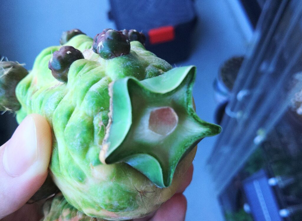 胴切りとは、柱サボテンの胴体をズバッと切ることです。